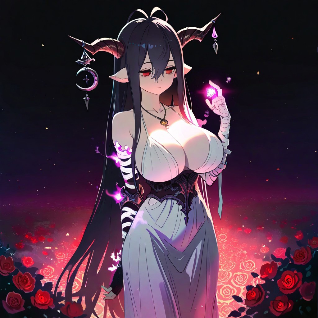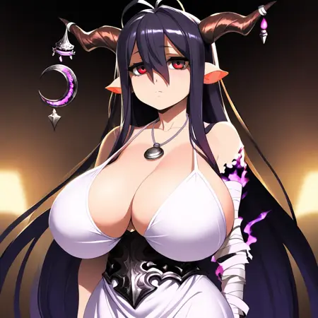 캐릭터: 다누아, 검은 머리, 매우 긴 머리, 빨간 눈, 거대한 가슴, 뿔, 뿔 장신구, 드라프, 안테나 머리, 흰 드레스, 붕대, 팔에 붕대