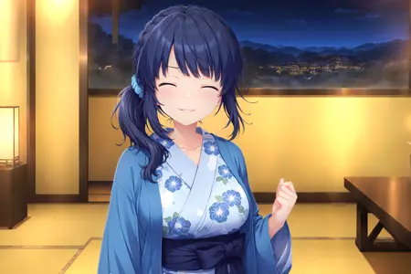 유카타: 유카타 키리하, 기모노, 일본 복장, 맨발, 유카타, 옆 긴머리, 띠, 어깨에 흐르는 머리카락, 파란 기모노, 긴 소매, 오비, 프린트 기모노, 하오리, 파란 하오리,