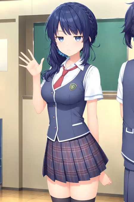 기본: 키리하, 파란 머리, 땋은 머리, 파란 눈, 긴 머리, 앞머리, 스럽치, 파란 스럽치, 중간 크기의 가슴,