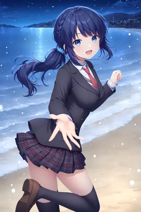 ジャケット+制服:ジャケットキリハ、タイツ、赤いネクタイ、茶色の靴、ネクタイ、ジャケット、プリーツスカート、黒タイツ、学ラン、黒ジャケット、白シャツ、ローファー、靴、シャツ、シャツ、チェックスカート、ミニスカート、ロングスリーブ、