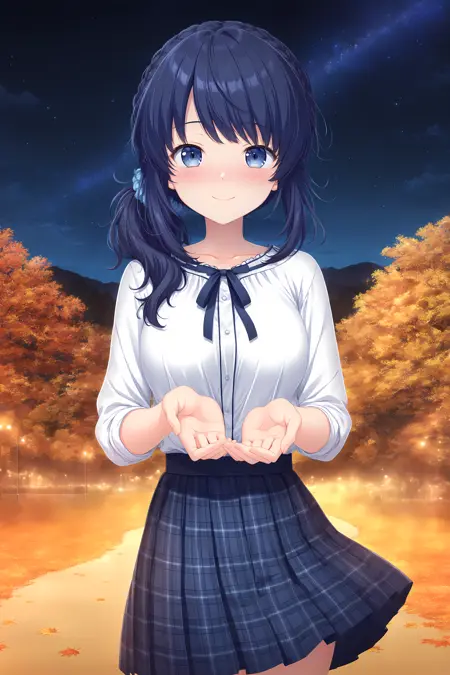 일상복: 키리하 일상복, 치마, 흰 셔츠, 셔츠, 체크 치마, 체크, 주름 치마, 검은 신발, 넥 리본, 리본, 신발, 파란 치마, 미니 스커트,