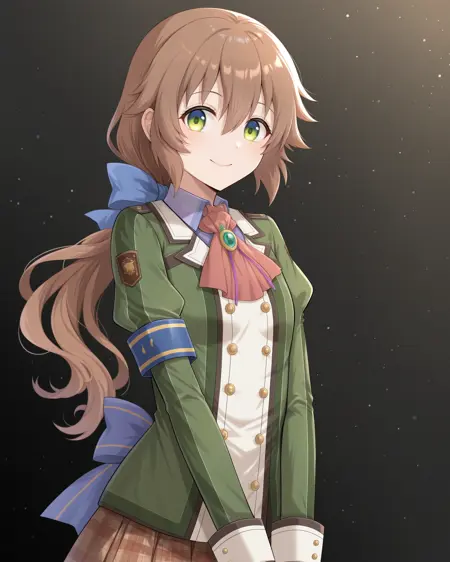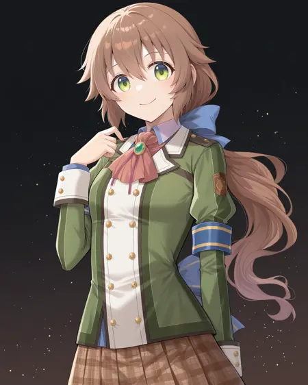 <lora:TowaHerschelCS1_Illustrious:1>, Towa Herschel, 棕色头发,低马尾,发带,绿色眼睛,娇小,小胸,校服,绿色夹克,长袖,红色领巾,蓝色臂章,格子裙,黑色连裤袜,棕色鞋子,