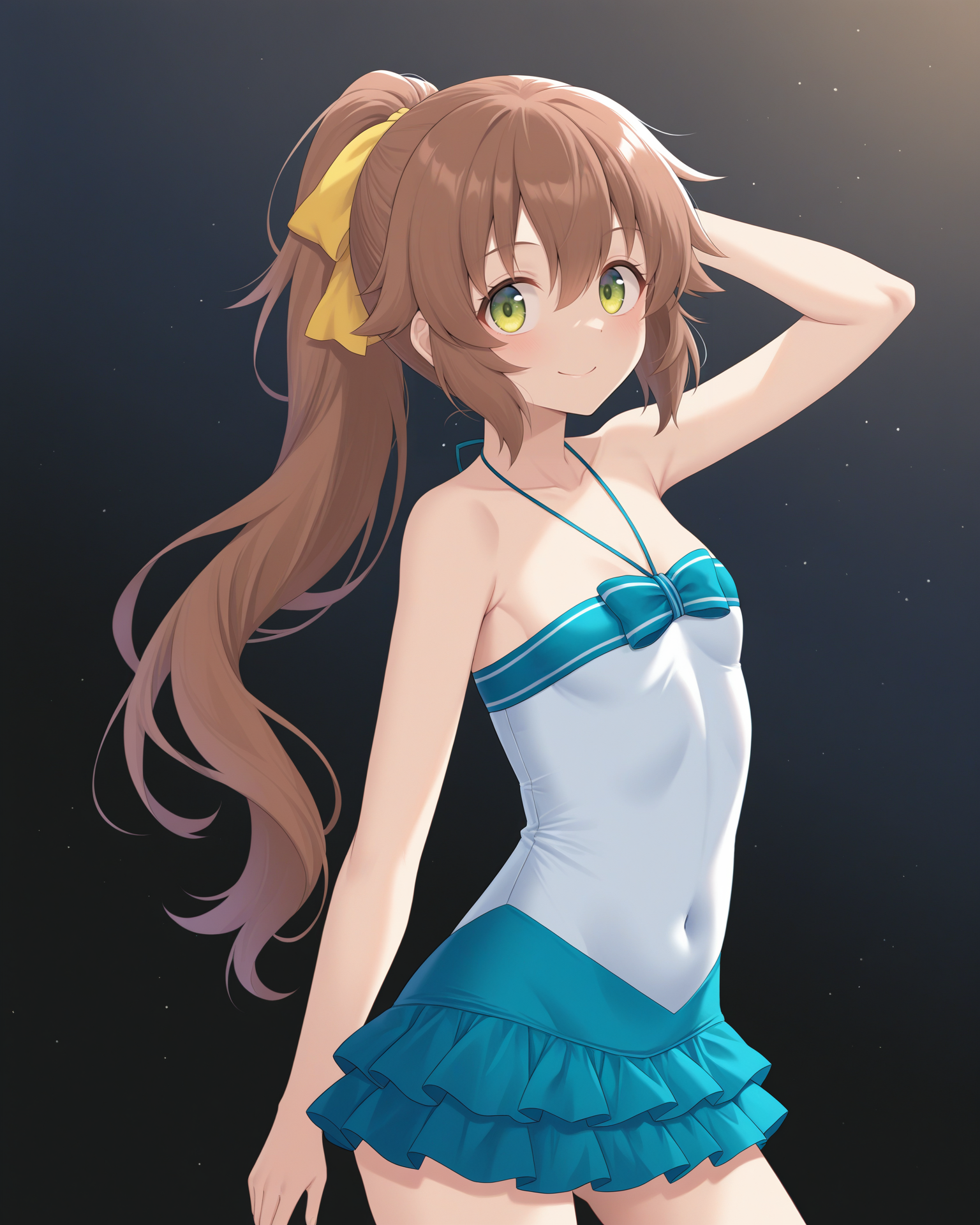 <lora:TowaHerschelSwimsuit_Illustrious:1>, Towa Herschel, 棕色の髪, ポニーテール, 黄色のリボン, 緑色の目, 小柄, 小さな胸, 白いワンピース水着, フリル付きスカート, サンダル,