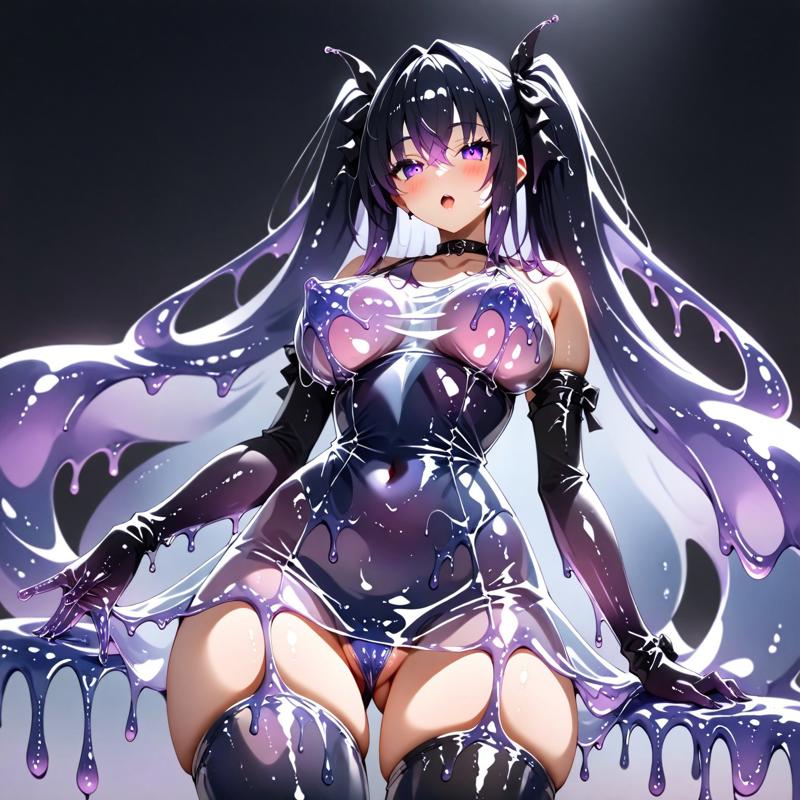 I recommend starting at around a 0.5 weight with tags/phrases describing the articles of clothing desired as being made of slime, made of translucent slime, etc. For extra transparency, especially seeing specific body parts through the clothing, describe the slime as see-through or the desired body part as being visible or visible through the slime/clothing.