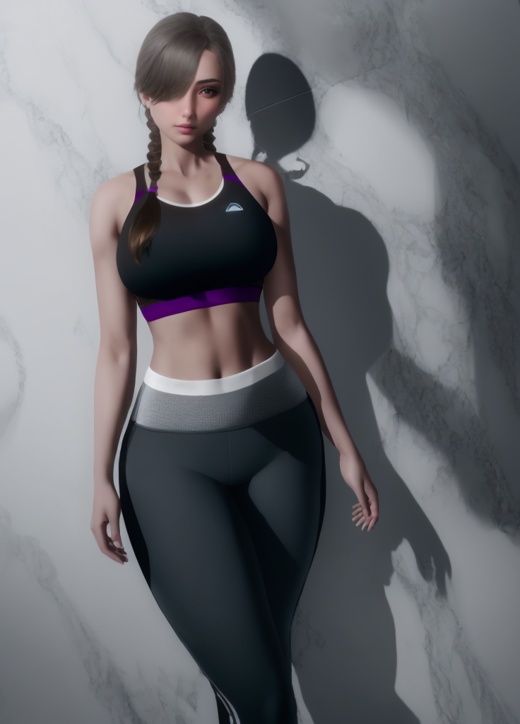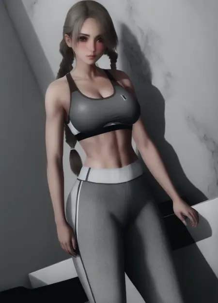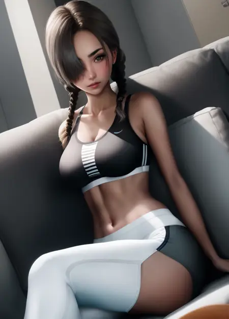 Etherium-dalia, 1girl, solo, brown hair, hair over one eye, breasts, looking at viewer, twin braids, pants, braid, sports bra, long hair, medium breasts, lips, blue eyes, shadow