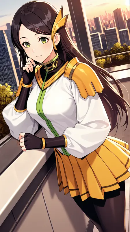 長髪、黒髪、緑の目、黄色の髪飾り、黄色の肩パッド、白シャツ、白トップス、黒い襟、多色のシャツ、白い袖、ふわふわ袖、黄色のスカート、黒手袋、長い手袋、指なし手袋、黒レギンス