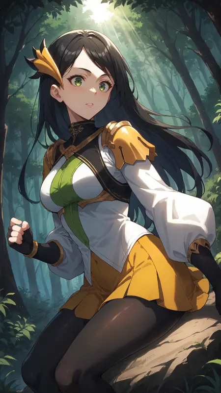 long hair, black hair, green eyes, yellow hair ornament, yellow shoulder pads, white shirt, white top, black collar, multicolored shirt, white sleeves, puffy sleeves, yellow skirt, black gloves, long gloves, fingerless gloves, black leggings