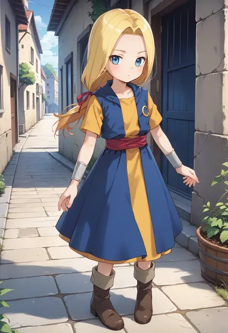 主要标签: 1girl, solo, 蓝眼睛, 长发, 低扎长发, 马尾, 金发, 丝带, 头发丝带, 连衣裙, 靴子, 棕色鞋履,