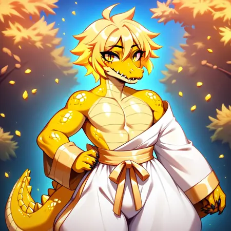 Tai the Croc(character), crocodile, Femboy, gold body, blonde hair, baggy pants,