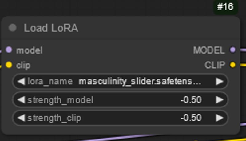 중요한 참고 사항 – 아래에서 언급된 모든 LoRA 값은 strength_model과 strength_clip 모두를 기준으로 합니다. 예를 들어, 남성성 스라이더는 strength_model -0.5 및 strength_clip -0.5로 혼합되어 있습니다. 따라서 베이스로 돌아가려면 strength_model +0.5 및 strength_clip +0.5로 해당 LoRA를 추가해야 합니다. 동일한 원칙이 제 프롬프트에도 적용됩니다. ComfyUI를 사용한다면 LoRA 입력에서 위에 언급된 값(LoRA에 사용된 clip 및 model strength)을 동일하게 설정해야 제 결과와 동일한 결과를 얻을 수 있습니다. (ComfyUI가 프롬프트로 LoRA를 입력할 때 이 값을 자동으로 적용하는지는 모르겠습니다. 적용하지 않으면 LoRA 로더 노드를 사용해야 합니다.) 이 LoRA의 링크는 아래에 있습니다.