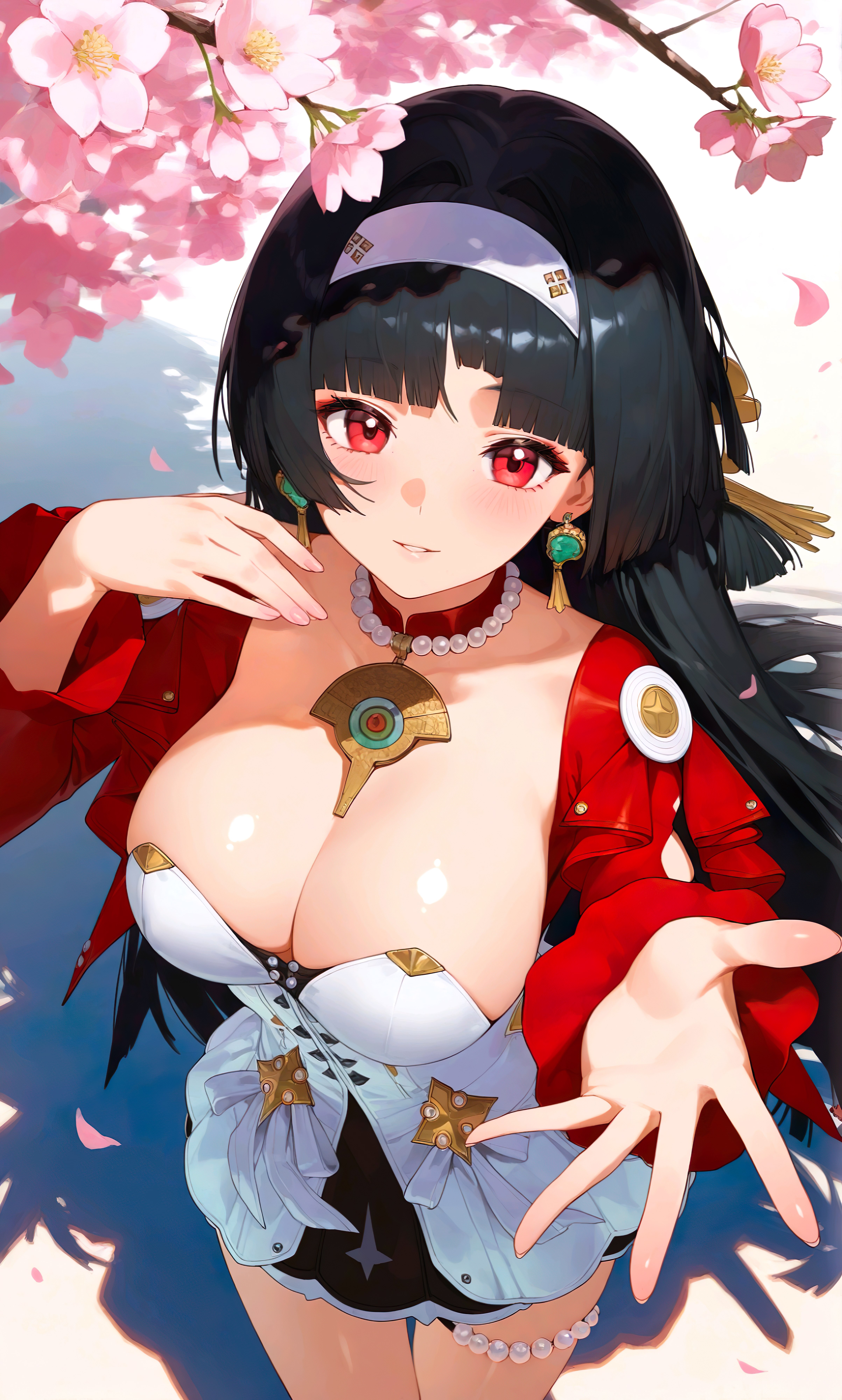 astra yao、赤い目、黒髪、非常に長い髪、バッタリした前髪、イヤリング、白いヘアバンド、髪飾り