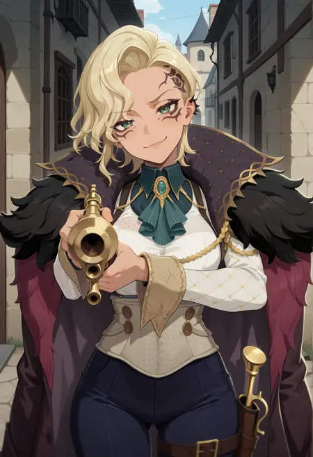 blonde hair, green eyes, asymmetrical hair, short hair, facial tattoo, ascot, white shirt, long sleeves, blue pants, coat, coat over shoulders, fur trim,