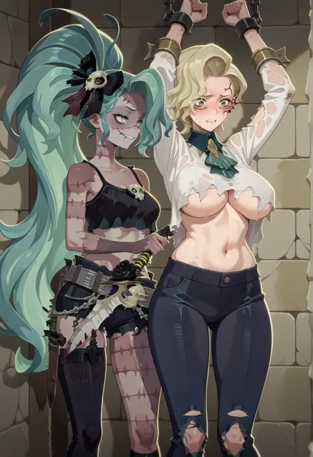 金发、绿眼、不对称发型、短发、面部纹身、围巾、白衬衫、长袖、蓝裤、外套、外套搭在肩上、毛皮镶边