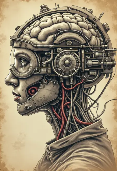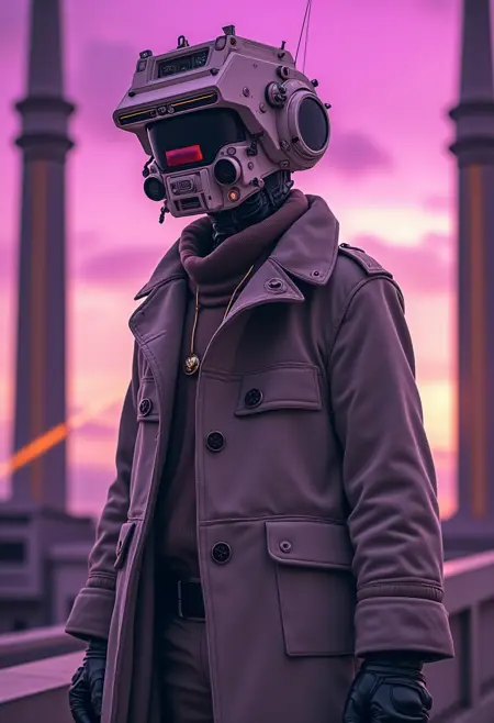 - 「サイバネティック」、「未来型防具」、「ロボティック強化」、「ヘルメット」、「ヘッドマウントディスプレイ」、「彫刻的頭部装飾」、「ビネット」、「映画的トーン」など。