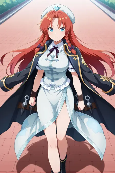 hong meiling, 1girl, solo, blue eyes, red hair, twin braids, long hair, breasts, hong meiling \(immovable demon's gate\), alternate costume, beret, white hat, grey hat ornament, black coat, gold trim, white shirt, white skirt, black boots, kunai,