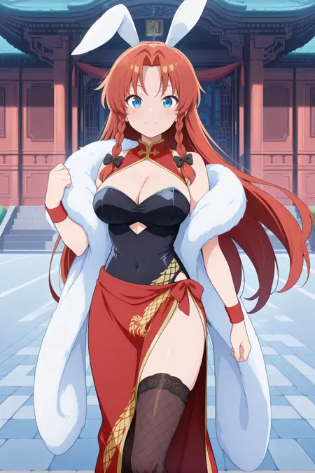 hong meiling, 1girl, solo, blue eyes, red hair, twin braids, long hair, breasts, hong meiling \(bunny scarlet devil mansion guard\), alternate costume, hair bow, black bow, white rabbit ear, china dress, chinese clothes, cleavage cutout, bare shoulders, black dress, fur scarf, playboy bunny, red skirt, sleeveless dress, cutout above navel, dragon print, side slit, black thighhighs, fishnet thighhighs,