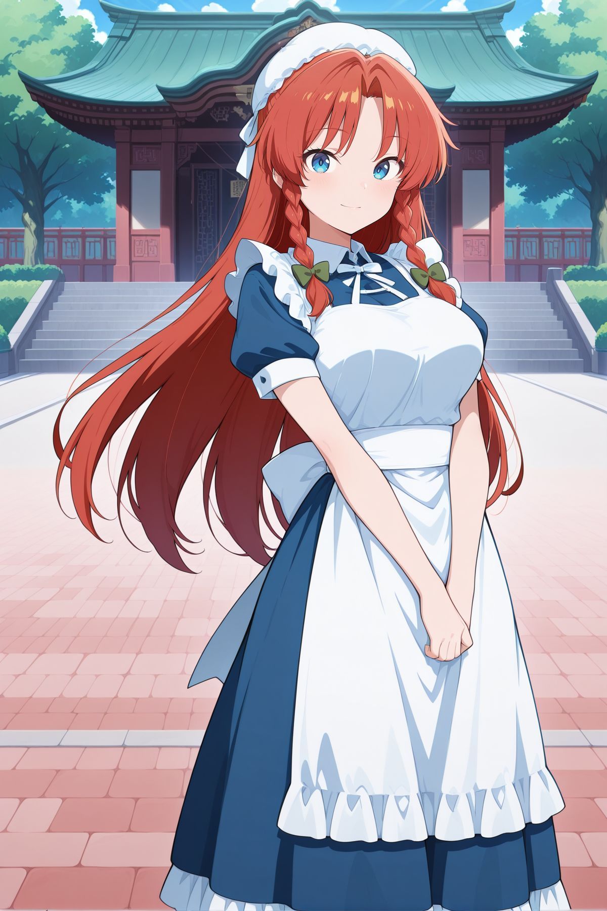 hong meiling, 1girl, solo, blue eyes, red hair, twin braids, long hair, breasts, hong meiling \(chinese maid for the day\), alternate costume, hair bow, green bow, blue dress, frilled dress, maid, maid apron, white apron,