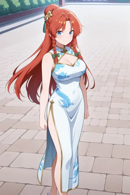 hong meiling, 1girl, solo, blue eyes, red hair, twin braids, long hair, breasts, hong meiling \(white rainbow gatekeeper\), alternate costume, hair bun, hair bow, green bow, hair ornament, dragon hair ornament, white dress, sleeveless dress, chinese clothes, cleavage cutout, side slit, high heels, white shoes,