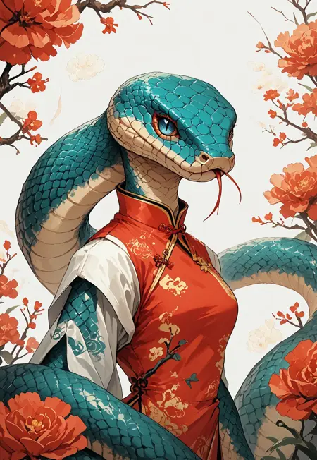 (画像:3~4枚の多様な例画像のコラージュ。異なる蛇のスタイルと中国新年の要素を紹介)