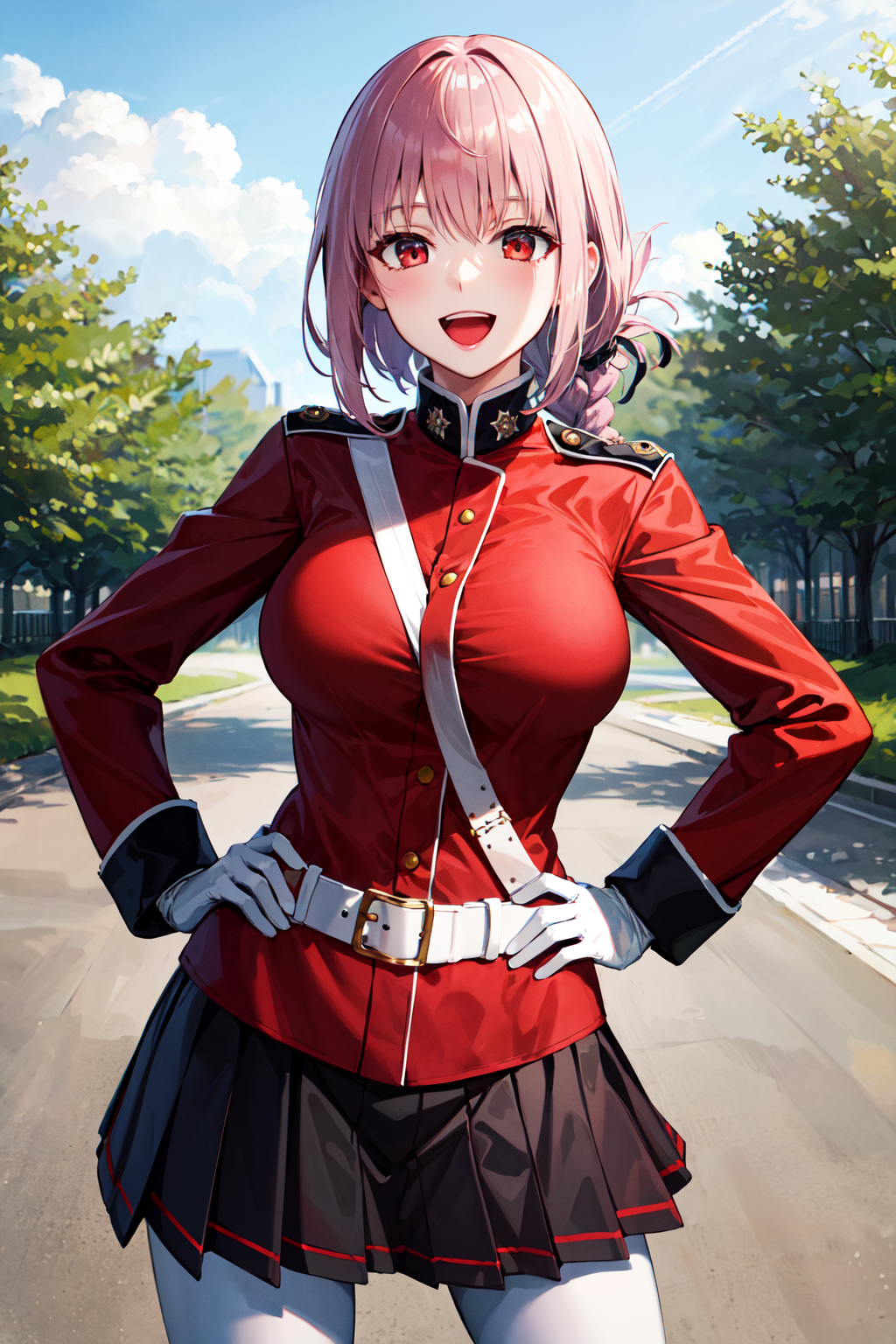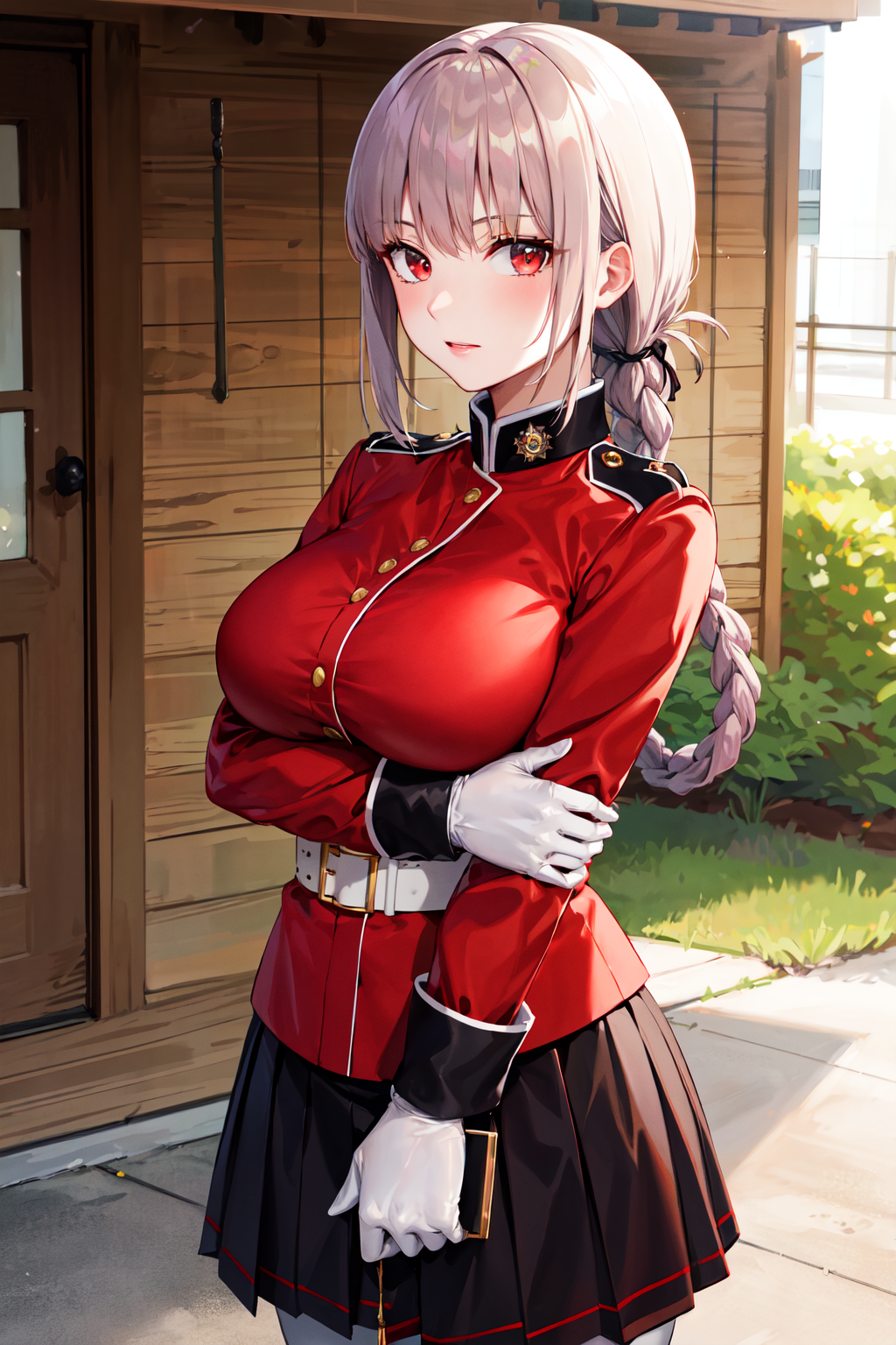 outfit1aafng, braid, large breasts, military uniform, red jacket, strap between breasts, white gloves, belt, pleated skirt, black skirt, white pantyhose
