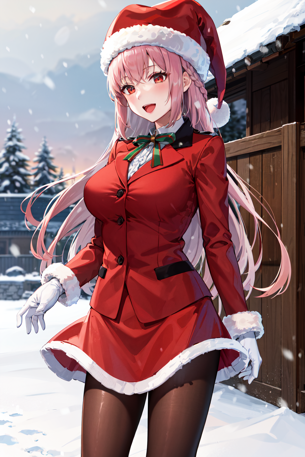 outfit4ddfng, long hair, braid, large breasts, santa hat, red headwear, pantyhose, santa costume, fur trim, white gloves, red skirt, pantyhose