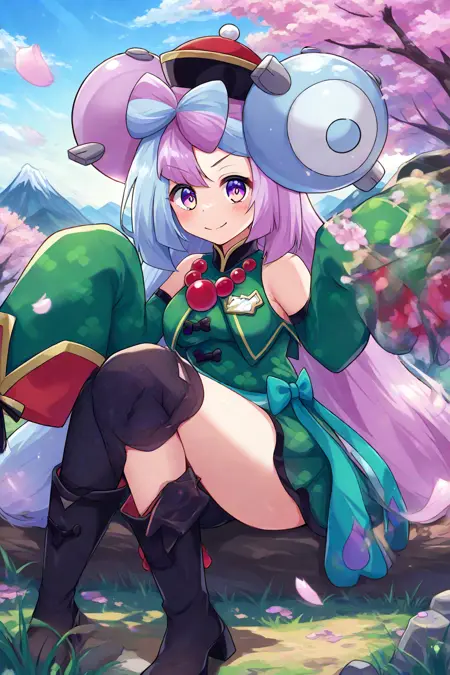 | 训练词汇 | falliono, purple_eyes, sharp_teeth, multicolored_hair, two-tone_hair, character_hair_ornament, bow-shaped_hair, chinese_hat, green_dress, deatached_sleevees, sleevees_past_wrists, very_long_sleevees, necklace, beads, single_leg_pantyhose, boots, black_footwear已复制! |