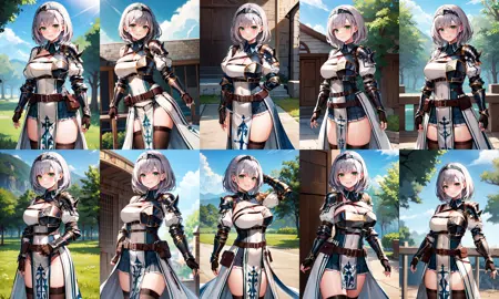衣装1aanoel、ミディアムヘア、緑色の瞳、ヘアバンド、青いカラー、肩アーマー、胸元の開き、胸のほくろ、アーマードレス、胸ベルト、ゴールドトリム、フィンガーレスグローブ、黒いグローブ、茶色のベルト、ポーチ、骨盤カーテン、黒い太ももハイソックス