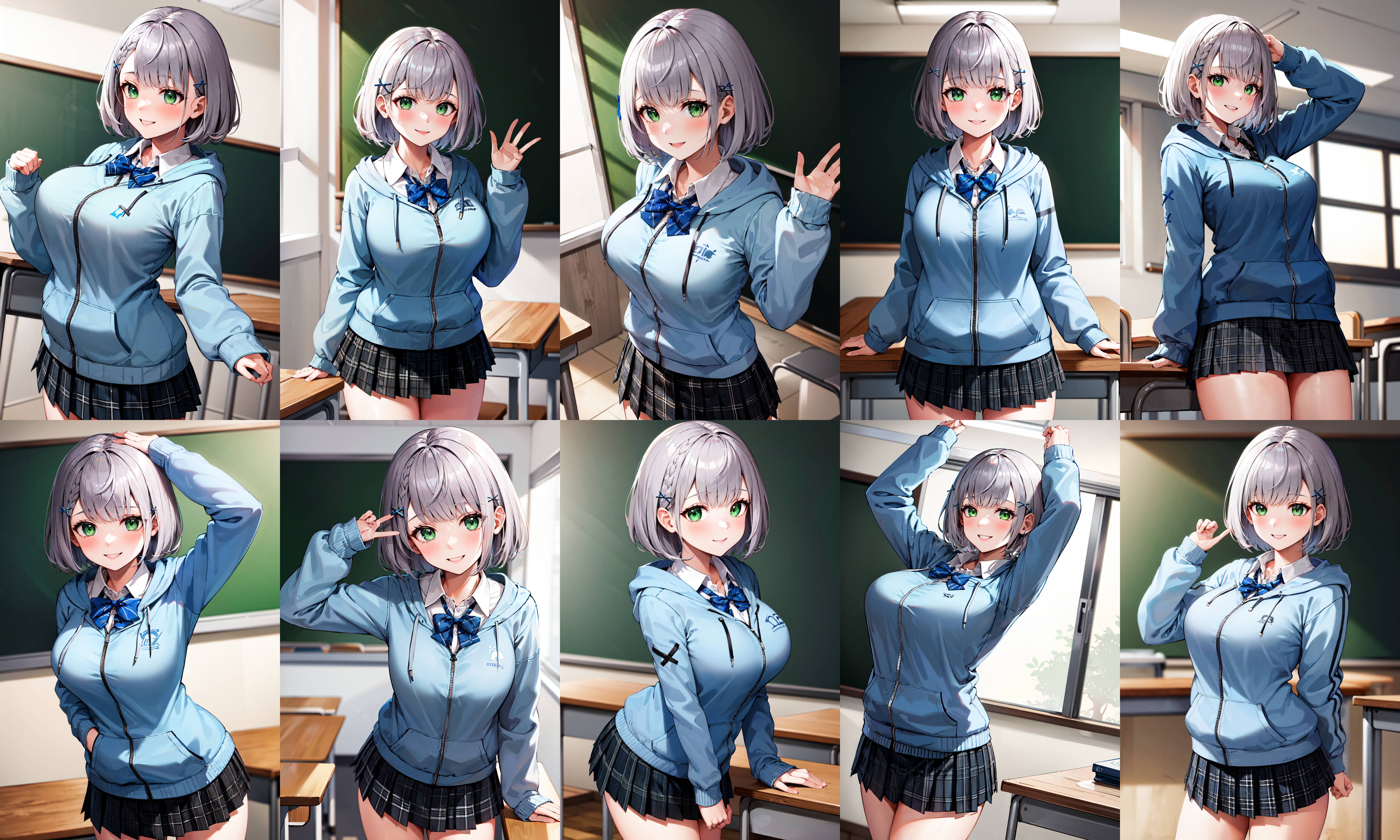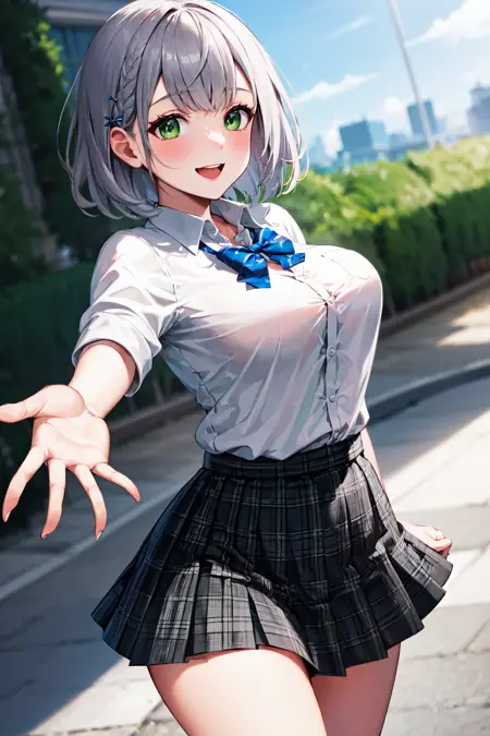 衣装6-2ffnoel、ショートヘア、x 髪飾り、緑色の瞳、青いボウタイ、白いシャツ、シャツカラー、黒いスカート、チェックスカート、プリーツスカート、ミニスカート