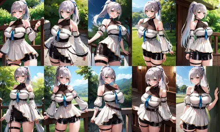 衣装5eenoel、ロングヘア、ポニーテール、髪飾り、ヘアリボン、緑色の瞳、ハーネック、透け感、青いネクタイ、黒いショートパンツ、肩を露出、白いドレス、取り外し可能な袖、太ももストラップ