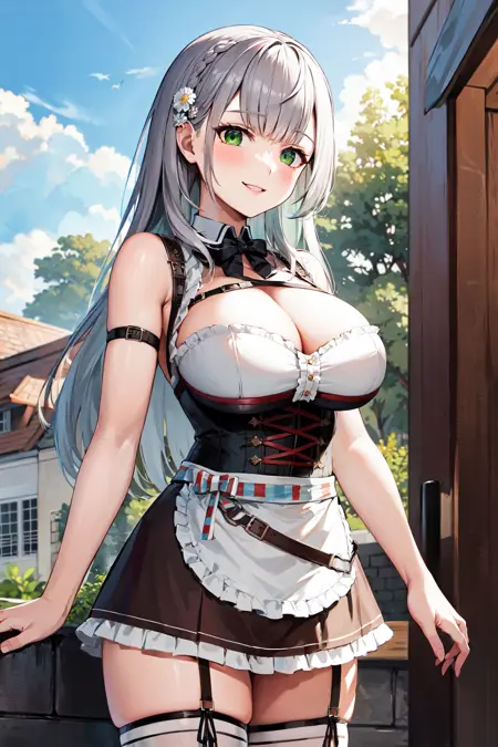 衣装4ddnoel、ロングヘア、編み髪、髪飾り、緑色の瞳、胸元の開き、ドイツ風衣装、フリル、ノースリーブ、コルセット、白いエプロン、ウエストエプロン、太ももストラップ、白い太ももハイソックス