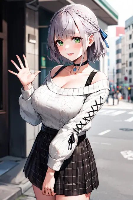 衣装3ccnoel、ショートヘア、フランス編み、ヘアリボン、緑色の瞳、黒いチョーカー、鎖骨、胸元の開き、オフショルダーセーター、白いセーター、チェックスカート