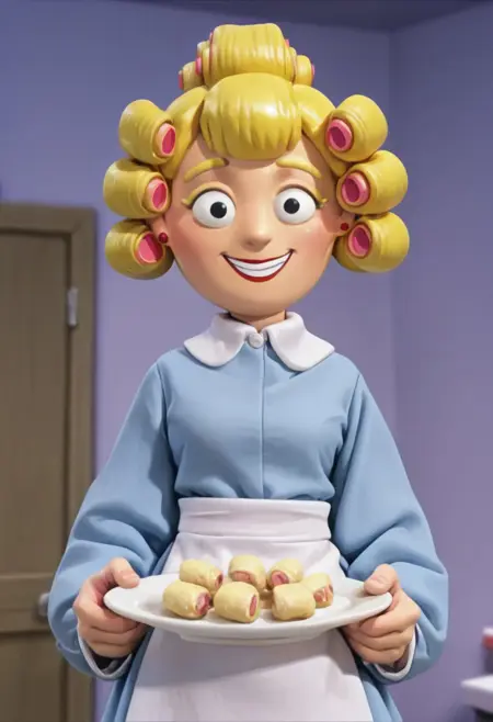 1girl, Solo, NurseBendy_MO, 밝은 피부, 금발, 단발, 검은 눈, 붉은 입술, 금발 눈썹, 작은 빨간 동그란 귀, 큰 눈