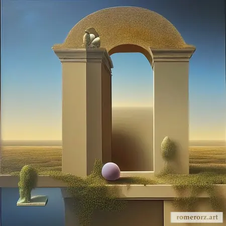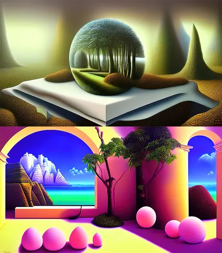 基于多张超现实主义艺术作品生成的基础图像,融入了一些达利风格的元素以及罗马/希腊建筑的影响。