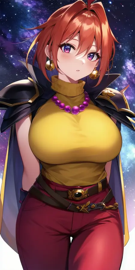 yellow_sweater_sleeveless_turtleneck_red_pants_belt_pauldrons_asymmetrical_armor_cape: 나가와 함께 있을 때의 슬레이어스 이전 의상.