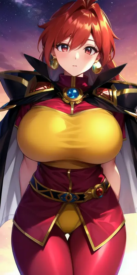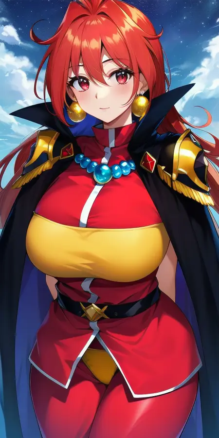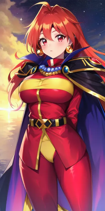 red_shirt_white_trim_turtleneck_yellow_bustier_framed_breasts_red_pantyhose_yellow_panties_over_pantyhose_belt_black_pauldrons_cape: 그녀의 오리지널 슬레이어스 의상. 가슴이 크면 가슴 사이의 틈이 생기기도 합니다.