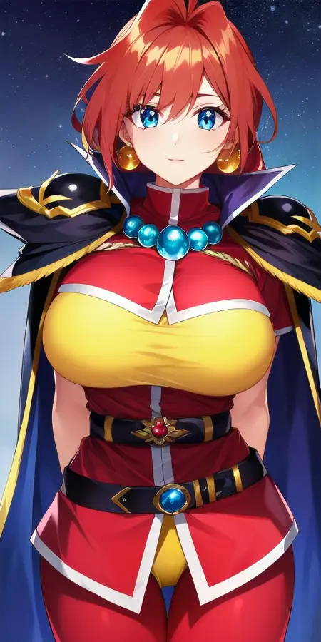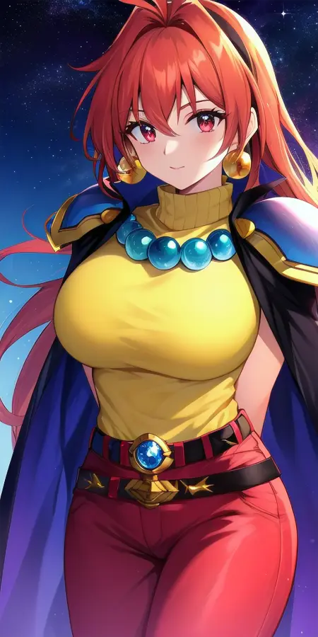 - red_shirt_white_trim_turtleneck_yellow_bustier_framed_breasts_red_pantyhose_yellow_panties_over_pantyhose_belt_black_pauldrons_cape:彼女のオリジナル・スレイヤーズ衣装。胸が大きいと時にセクシーな谷間が出ます。