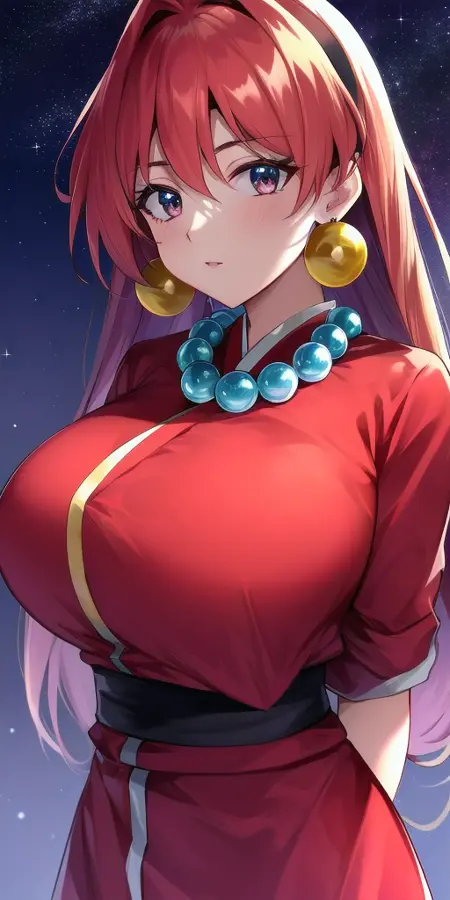 lora:LinaIverseLoraV5:0.7 lina_inverse_ahoge, sphere_earrings, black_headband, bead_necklace