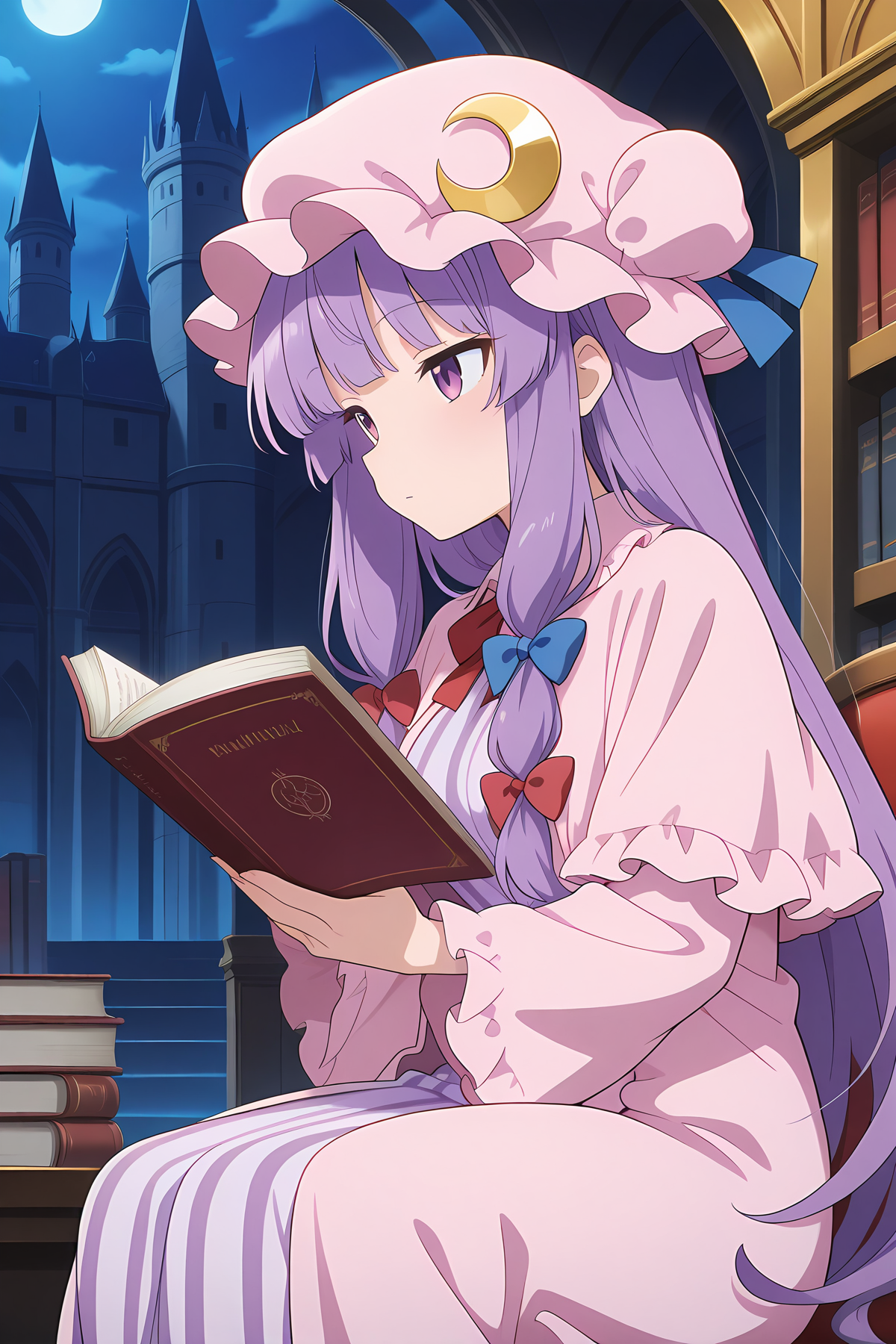 patchouli knowledge, 1girl, solo, purple hair, long hair, purple eyes, sidelocks,