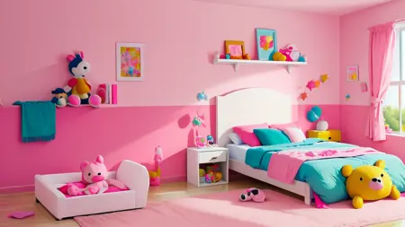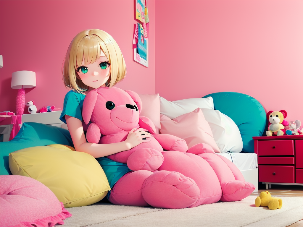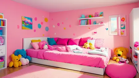 trigger:pinkroom, pink wall, bed, stuffed toy, pillow, couch