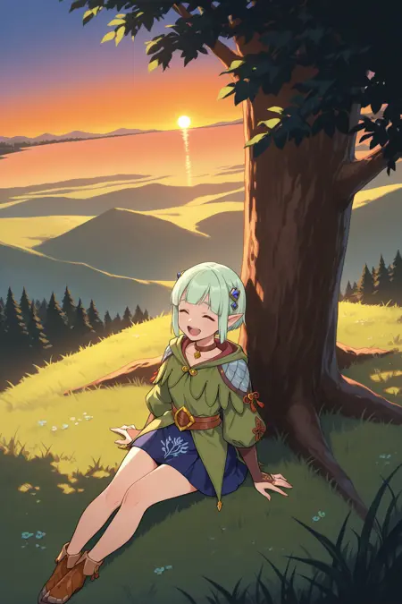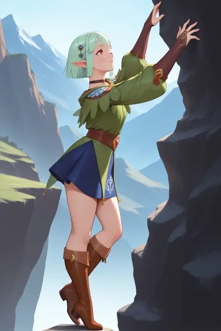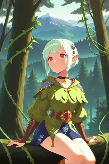 Add "hair ornament, choker, green tunic, puffy long sleeves, brown belt, blue skirt, brown bridal gauntlets, brown boots" for her typical look.