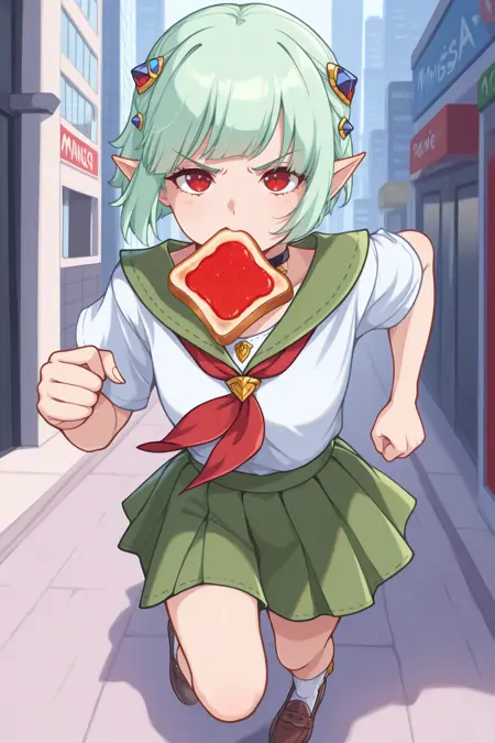 Trigger word is "mhsEna" and "mint green hair, short hair, blunt bangs, pointy ears, red eyes" is required.