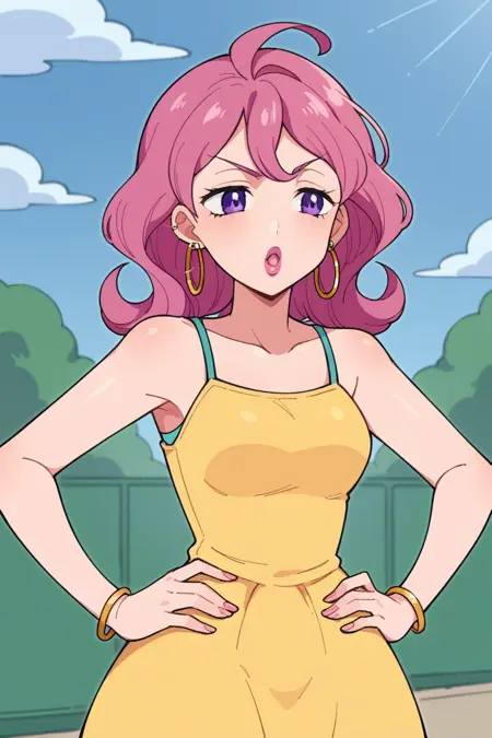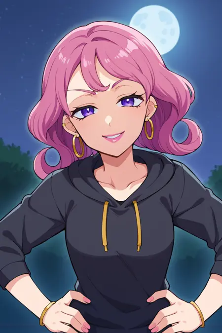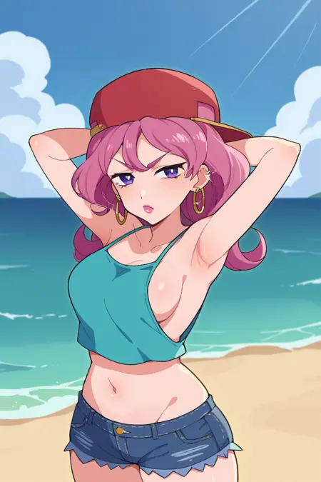 Key word is pkmncenterladykitakami and for default outfit use: red hat, sideways hat, pink hair, purple eyes, hoop earrings, ring, bracelet, pokeball_apron, green shirt,