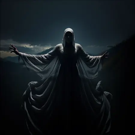 banshee, cloak, facing away, flying, from behind, hood, long hair, looking at viewer, open mouth, outstretched arms, screaming, skeletal, spread arms, standing, teeth, very long hair