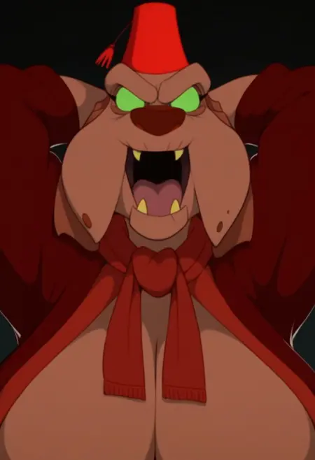 긍정적 프롬프트: DRAD2, 털이 많은, 인트로, 개, 노년의 남성, 빨간 페즈, 머리 장식, 처진 귀, 녹색 공막, 눈동자 없음, 갈색 코, 갈색 몸체