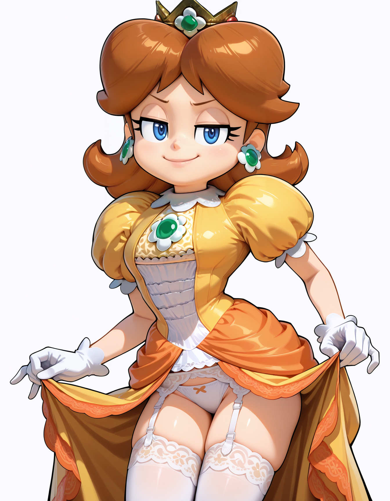 默认装扮:ssbu_princess_daisy, 1girl, 棕色头发, 蓝色眼睛, 珠宝, 手套, 耳环, 王冠, 发带, 蓬松肩部, 橙色连衣裙,