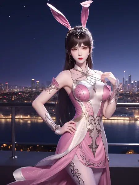 - DLDLxiaowu, 1girl, solo, 토끼 귀, 갈색 머리, 긴 머리, 흰색 핑크 드레스, 단발머리, 머리 장식, 보석, 시청자 바라보기, 흰색 팬티스타킹, 손목 cuffs, 도시 풍경, 밤, (가벼운 미소:0.3), 커우보이 샷, 허리에 손을 대고, 금속 목걸이,