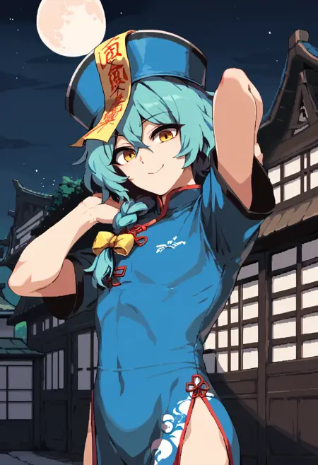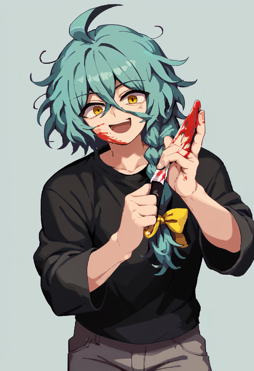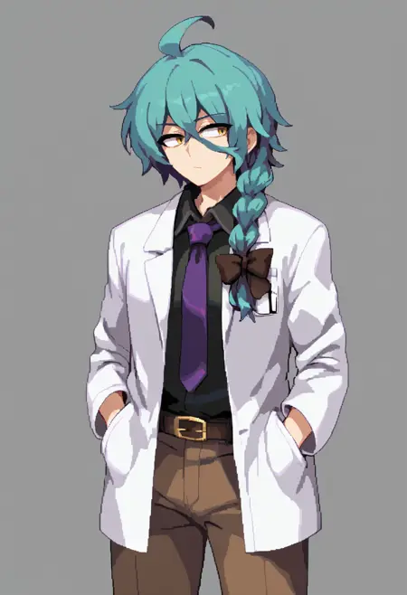 青绿色头发(见上文。我会使用此标签,因为我所用的风格Lora会将他生成为较浅的发色)