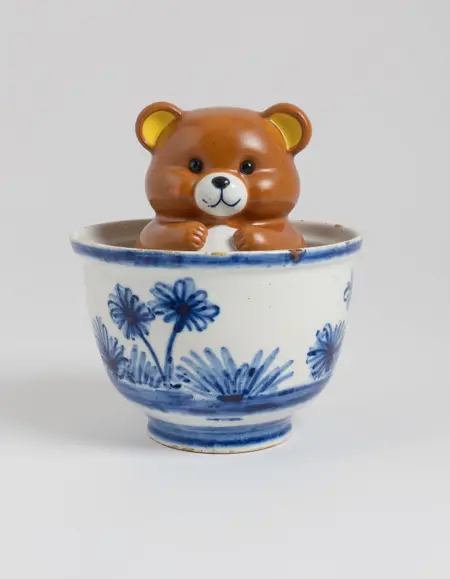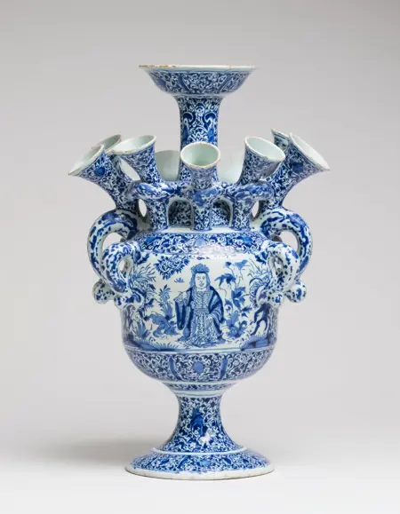 전통 복장을 입고 모자를 쓴 남자의 모습이 변기 위에 그려진 세라믹의 사진. 주변에는 파란색 꽃무늬와 기하학적 무늬가 둘러싸고 있으며, 배경에는 큰 모자와 통이 있고, 흰색 표면 위에 델프트웨어 스타일로 표현