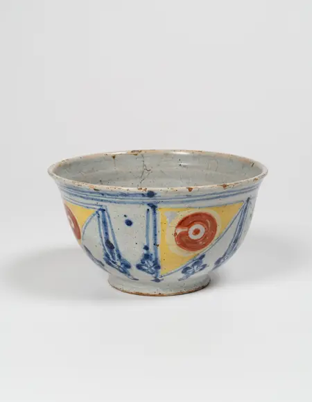 녹색 잎사귀와 주황색 꽃으로 장식된 가지 위에 앉아 있는 다채로운 앵무새의 모습이 세라믹에 그려진 사진. 배경은 흰색 세라믹 접시이며, 파란색과 노란색 테두리가 있는 델프트웨어 스타일