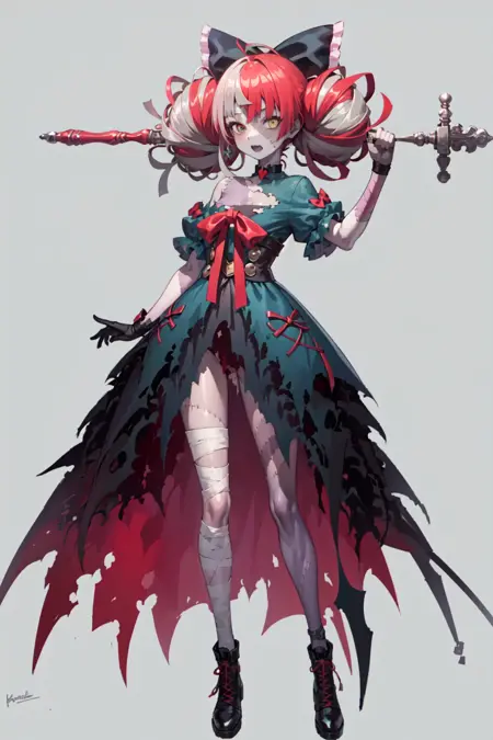 기본 옷차림에 가까운 예시(검은 칼은 별로입니다): 활, 어긋난 신발, 붕대, 이중 머리묶음, 머리꽂이, 비대칭 신발, 찢어진 옷, 둔한 끝, 검은 활, 드레스, 빨간 활, 찢어진 드레스, 머리에 활, 붕대 감긴 팔, 검은 드레스, 붕대 감긴 다리, 신발, 빨간 신발 모양의 동공, 부츠, 교차 끈 신발, 하트 목걸이, 앞머리, 짧은 소매